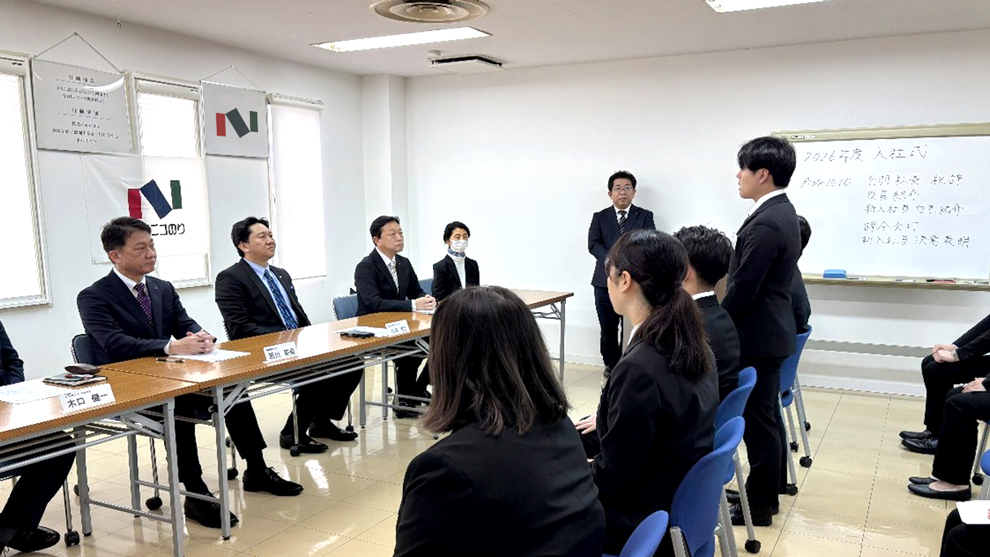 ニコニコのり株式会社では4月1日に入社式を行い、新入社員11名と本社・大阪支店の社員が参加しました。